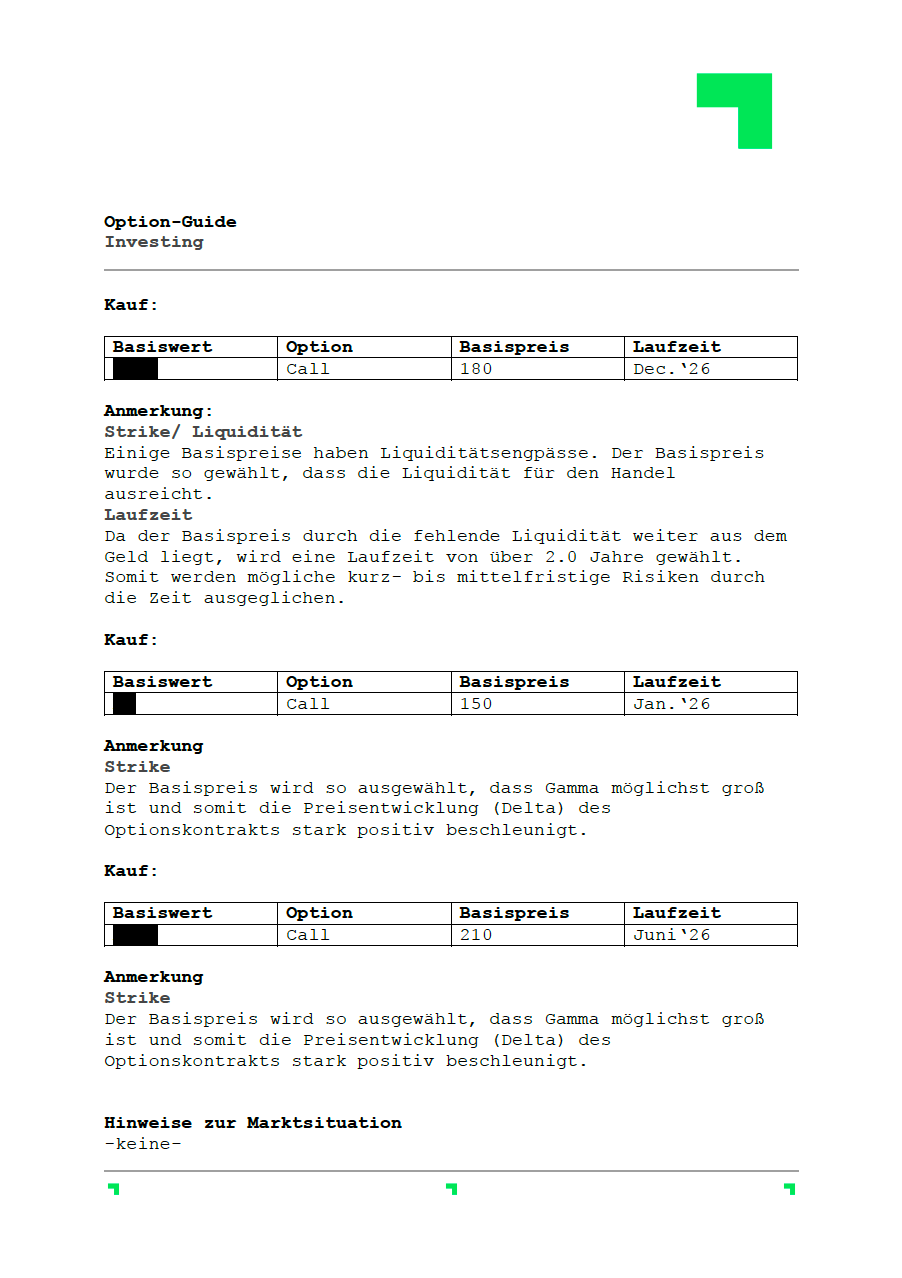 zum NewsletterLinks bzw. oben ist der Aufbau des Option-Guide beispielhaft dargestellt. Neben den relevanten Details zum Handel spezifischer Optionskontrakte gibt es praktisch relevante Anmerkungen zur Optionswahl. Unter diesem Link findest du ein Video zur Optionskette und wie du darin Optionen findest und auswählst. Außerdem sind in einem weiteren Video wichtige Information zur Ordereingabe enhalten.